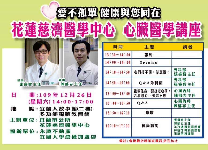 宜蘭市長江聰淵表示:此次講座由外科部張睿智主任(美國杜克大學實驗病理學博士、慈濟大學醫學士)及心臟內科陳郁志主任(英屬蒙塞利特亞美利加大學加勒比恩醫學院醫學系醫學博士)擔任主講者,張睿智主任為宜蘭子弟,在江聰淵市長的力邀之下,特別返鄉為鄉親提供心血管疾病提早治療及心臟相關知識,進而減低疾病對家庭的衝擊,也希望未來花蓮慈濟醫學中心能有更多機會至宜蘭辦理相關醫學講座及健康諮詢,共同為健康活力社會而努力。