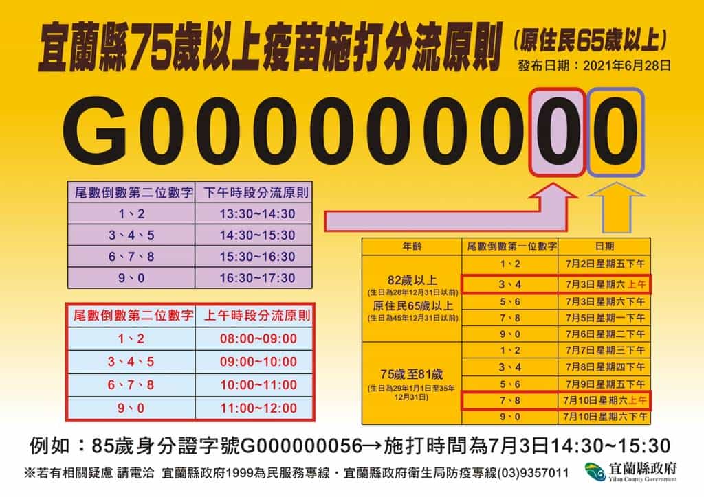 有關宜蘭縣疫苗施打情形,衛生局指出,75歲以上長者將於今(28)日完成AZ疫苗施打,接種率約三成左右。中央即將配發莫德納疫苗,為協助更多長者方便且安心的接種疫苗,已安排7月2日至7月6日為82歲以上的長者(原住民65歲以上)施打莫德納疫苗;7月7日至7月10日為75歲至81歲的長者施打莫德納疫苗。