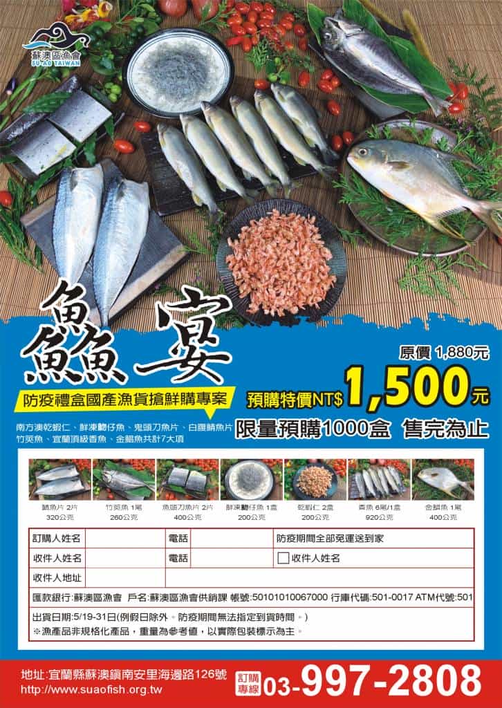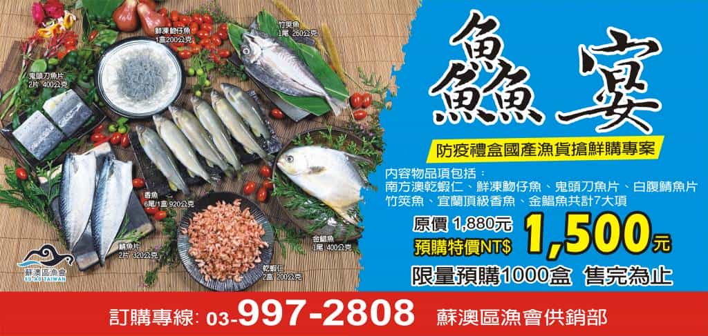 疫情緊張,害怕出門買東西?別擔心!!!蘇澳區漁會幫您準備好了,防疫超值國產海鮮禮盒,一次購足,買到賺到,本會在疫情嚴峻情況下,特為消費者把關,推出防疫禮盒國產漁貨搶鮮購專案,原價:1880/盒,搶鮮購優惠價:1500/盒,限量1000盒,全部免運送到家。加入蘇澳區漁會LINE生活圈(ID:@azs6931n)訂購前100名者,每人1盒享九折優惠,名額有限、及早搶先 ! 即日起至售完為止。