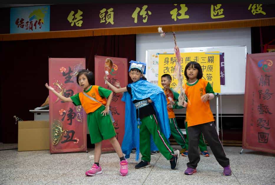 蘭陽戲劇團昨日(20日)也進行了本次計畫最後一堂課程,帶著小朋友回到歌仔戲的發源地-結頭份大樹公,並邀請結頭份社區發展協會演出一小段本地歌仔,四週的課程下來,學生都能將演出的內容跟之前上課教過的知識連結起來,並且主動參與。最後分組驗收展演「七字調」,學生也都能朗朗上口,更發揮自己的創意融入其中。