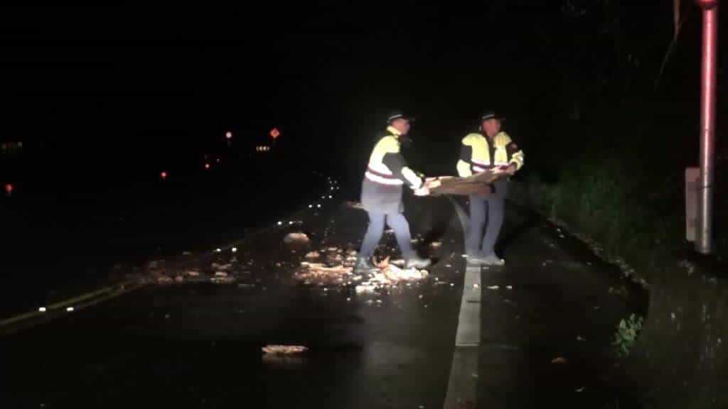 所長許維棟、警員余燦光發現,因連日雨勢不斷,以致邊坡土壤鬆動,造成路樹傾倒,由於樹塌位置橫置路面中央,且事發地段無路燈照明,對來往車輛造成危險,嚴重影響民眾行車安全,渠先行實施安全警戒,擺放交通錐警示,並立即聯手將路樹搬運至路邊,亦協助清除傾倒之路樹,恢復雙向通車,民眾對於警方維護村民及用路人安全之舉動,公開讚譽人民褓姆之義行。