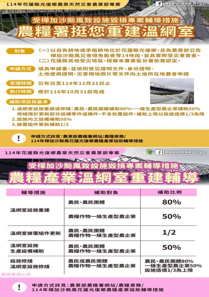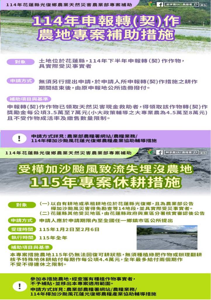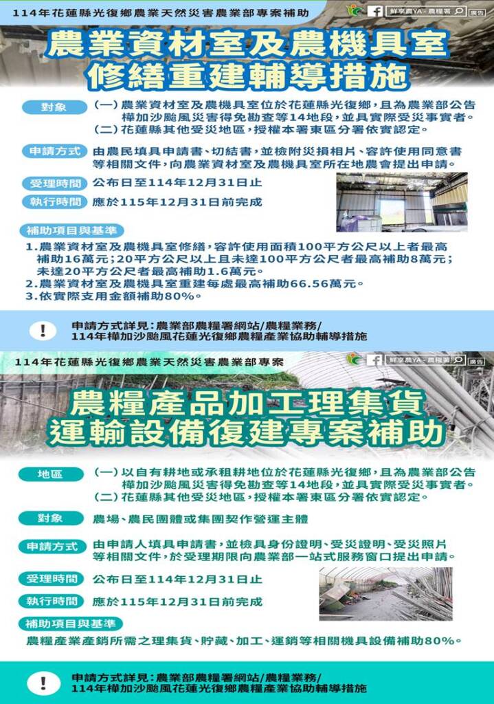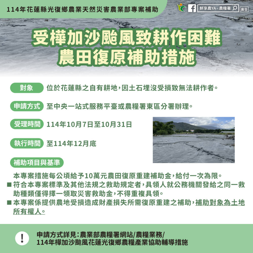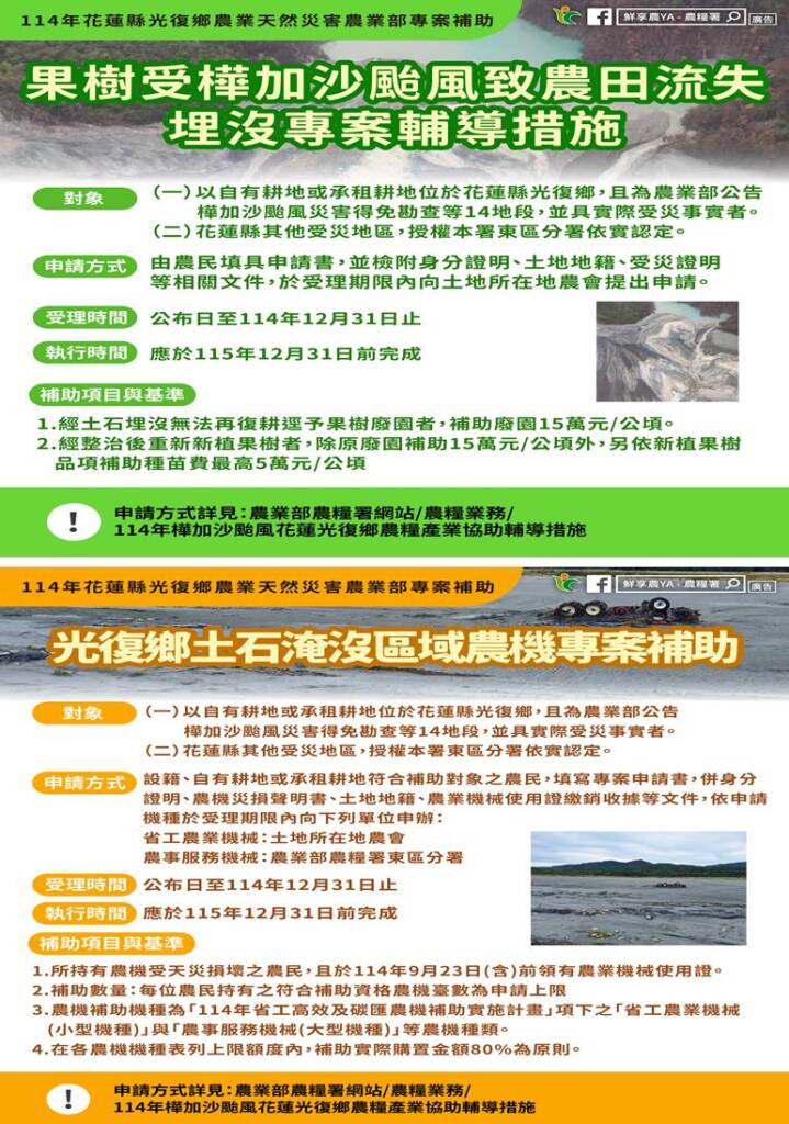 農糧署東區分署說明,該分署於107日至12日派員進駐在光復鄉設置的行政院一站式服務平臺,及於1013日至17日在鳳榮地區農會開設「農民服務站」,為提供農民即時、便利的災後復原與重建服務,減少農友往返奔波,該分署持續於光復鄉及鳳林鎮設立服務站,受理各項產業重建及輔導措施,另外於該分署花蓮辦公區於上班時間亦持續受理申請,凡自有或承租耕地受樺加沙颱風影響,具實際受災情形之農民,均可就近前往以下地點申請:
