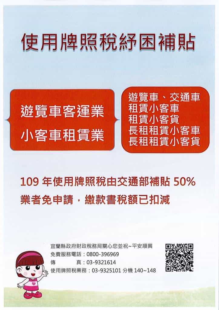 宜蘭縣政府財政稅務局表示,針對遊覽車客運業和小客車租賃車之營業車輛,交通部補貼其109年使用牌照稅50%。故該補貼對象收到今年度使用牌照稅繳款書,其本稅扣減政府補貼金額50%後,應繳金額已為本稅之半數,納稅義務人只須在期限內繳納,無需再另行申請補貼。另因辦理車籍異動已繳納本年度未補貼前稅額,該局將於交通部補貼款核定撥付後主動辦理退稅。