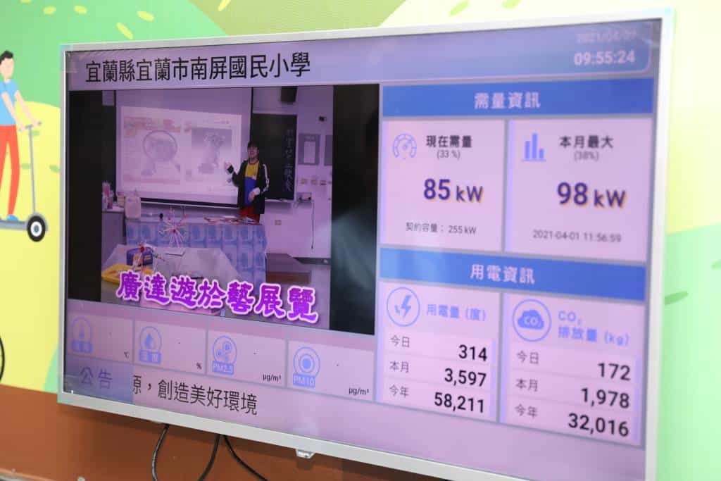南屏國小夏明義校長表示,非常感謝市公所的班班有冷氣政策,南屏國小在去年八月即執行完成,並率先於暑假返校日全面啟動,讓師生與家長感受到市公所的用心,而為了讓班班有冷氣的設備更加完整,學校更在中央走廊設置了一面能源牆,將能源管理系統及全校用電量即時呈現在電視畫面上,可讓學童及教職員知道冷氣啟動時的二氧化碳排放量,以利進行環境教育,未來待經費允許下將陸續引進溫度、濕度、PM2.5、PM10等功能,讓數位能源訊息更完整。