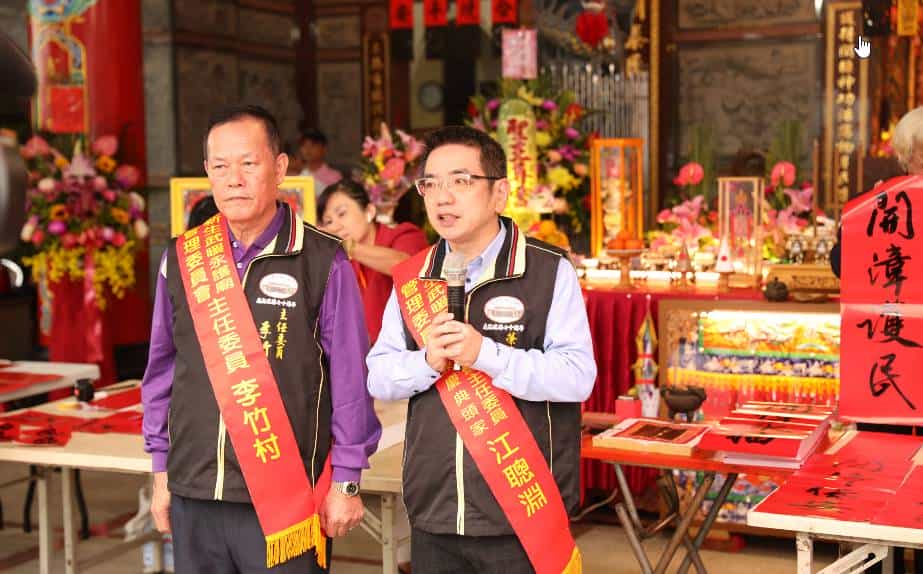 農曆新年腳步越來越近,也代表著舊一年的完結及新一年的開始,為了替來年祈福,主任委員李竹村特地邀請書法名家吳大仁大師於廟亭揮毫書寫春聯,並請 開漳聖王敕印,希望透過 開漳聖王加持的吉祥春聯,庇佑民眾來年平安吉祥,宜蘭市長江聰淵亦在吳大仁大師現場指導下,親自揮毫分送信眾,現場氣氛熱鬧喜氣。