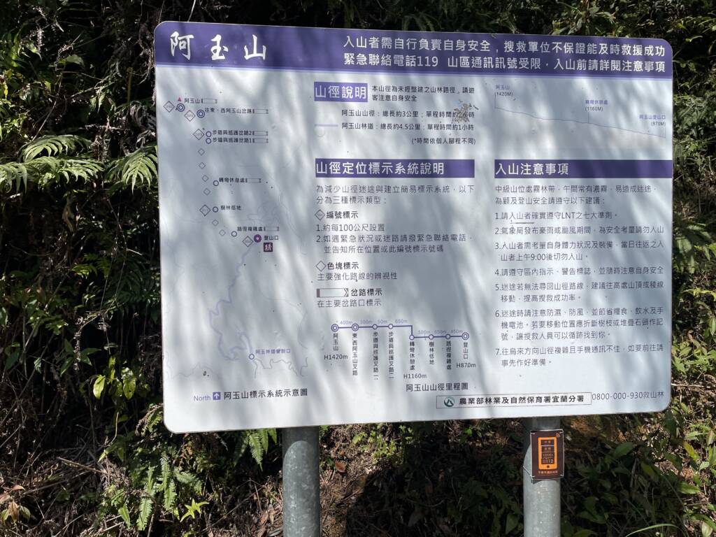 宜蘭分署也於阿玉山林道每500公尺加設里程牌,自林道口至阿玉山山徑登山口計4.5公里,維持林道暢作為山域緊急救援通道。山徑相關通訊資料每年彙整提供林業及自然保育署作為政府開放資料「山區手機可通訊點標示資訊」,供電信業者更新與民眾登山通訊參考使用。同時也與臺灣登山常用離線地圖「魯地圖」合作更新資訊,讓山友透過離線地圖即可掌握所在里程位置與通訊情形。