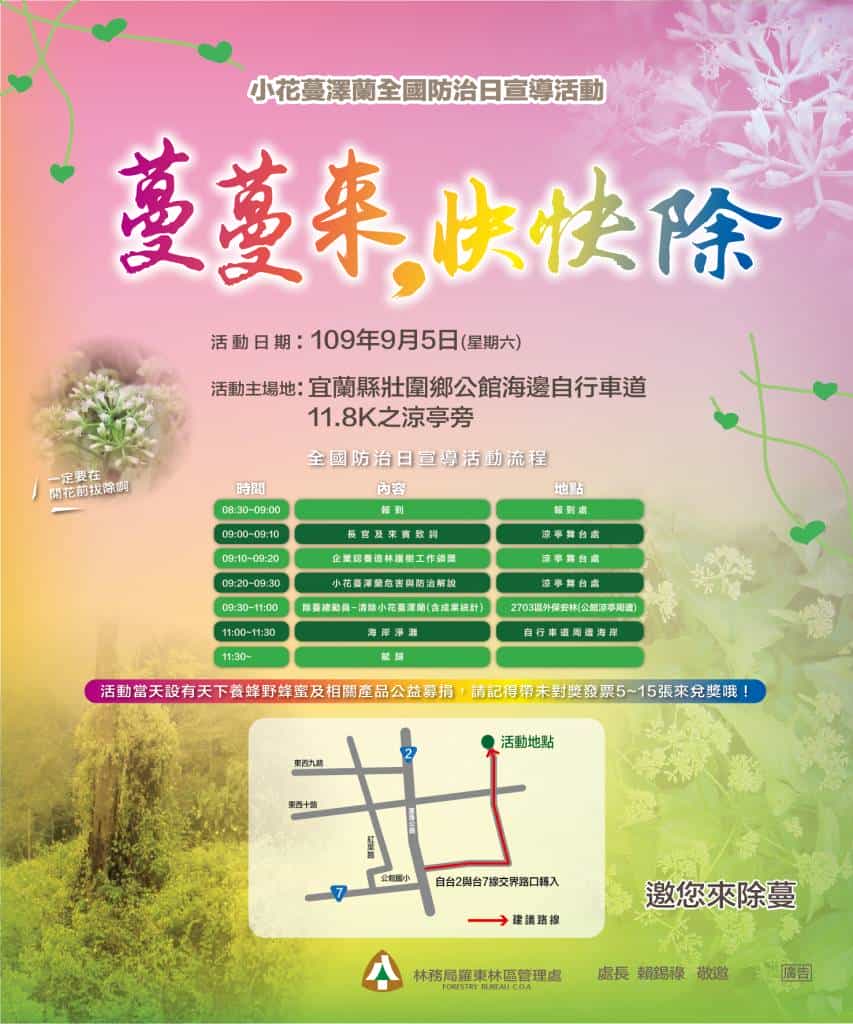 今年的9月5日是小花蔓澤蘭全國防治日,林務局羅東林區管理處將於當日上午8時30分,在壯圍鄉公館海邊自行車步道11.8K處,舉辦「蔓蔓來 快快除-小花蔓澤蘭全國防治日宣導暨淨灘活動」,再次集結政府機關、企業志工及社區民眾力量協力清除小花蔓澤蘭及淨灘,歡迎有興趣的大朋友、小朋友攜手共創山海好環境。