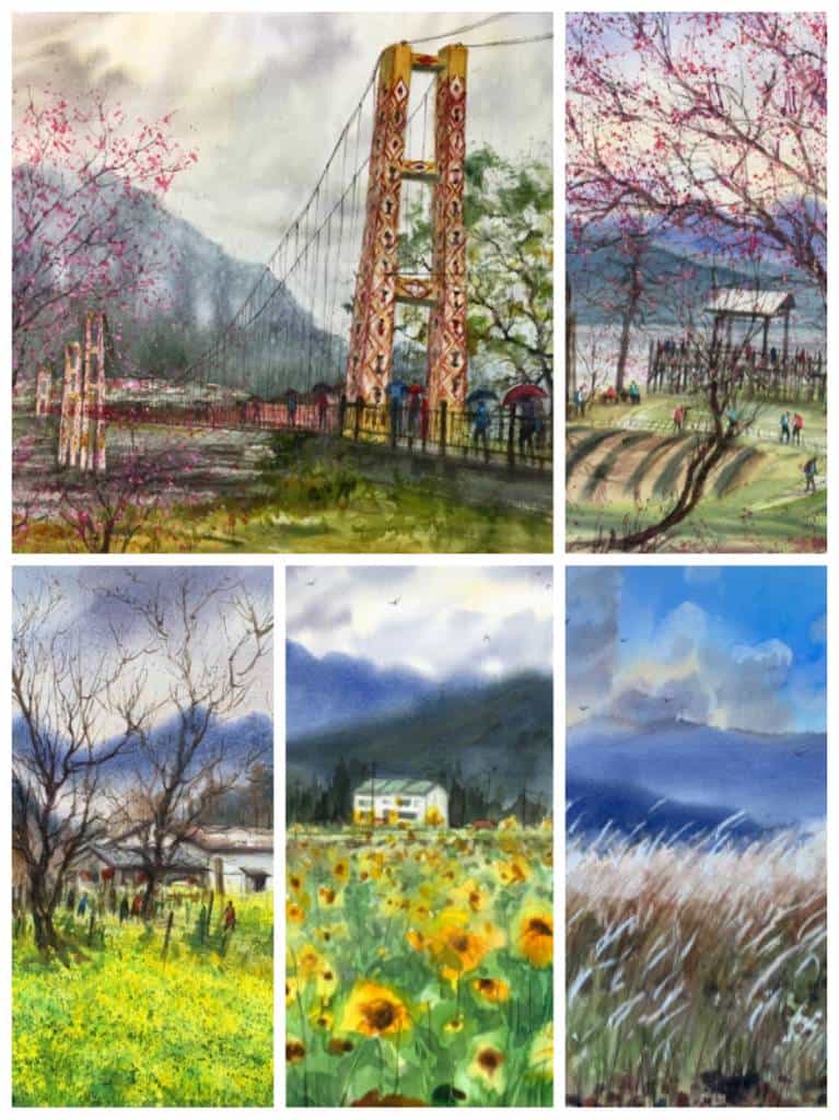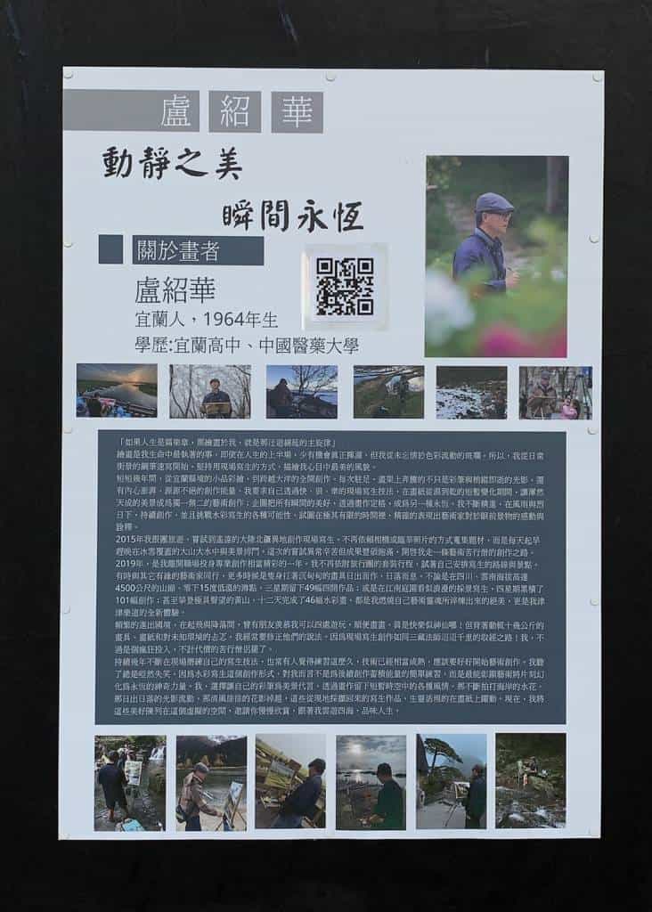 「蘭陽風情畫」系列畫作將帶您飽覽宜蘭的山光水色與人文景緻,沿著濱海眺望龜山島,隨著潮水起落、晨昏日落展現出蘭陽平原自然的風貌;當稻香吹起、蔥田再綠,又是另一種四季幻化的黃金稻田、水田、花田等田園風貌以及代表宜蘭人文的宜蘭文學館、幾米公園、宜蘭火車站…等等。盧老師的創作特色是透過現場寫生技法,在畫紙從濕到乾的短暫變化期間,讓渾然天成的美景成為獨一無二的藝術創作;欣賞他的畫作宛如置身其中,讓您感受畫家堅持用寫生方式融入環境之中,用大地當畫室,讓感動與感性隨畫筆「刻畫動靜之美、留下瞬間永恆」。