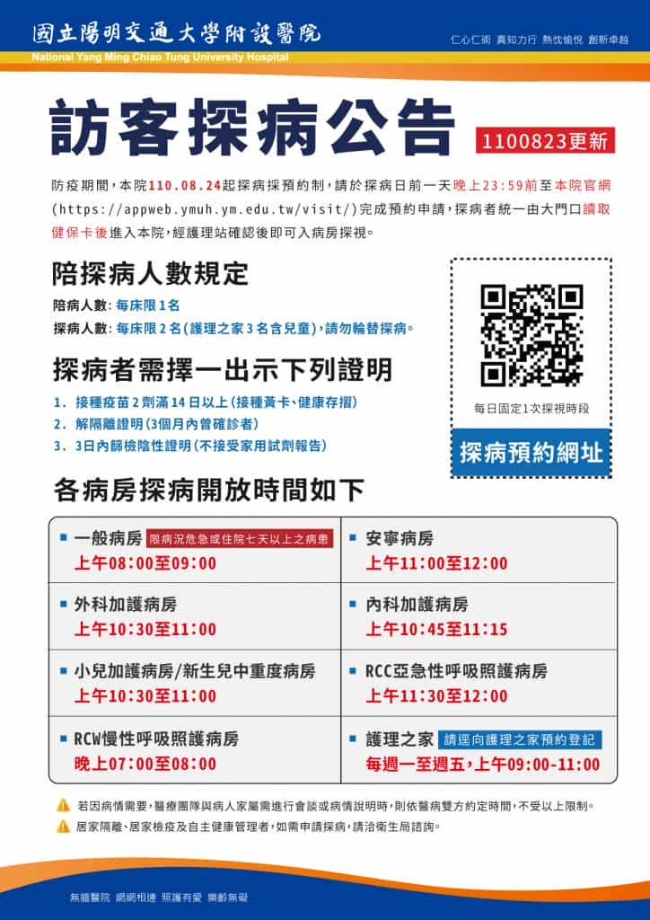 因應嚴重特殊傳染性肺炎(COVID-19)疫情發展,陽明交大醫院自110.08.24起探病採預約制,管制措施如下: