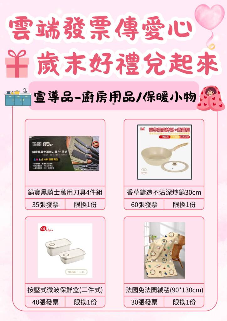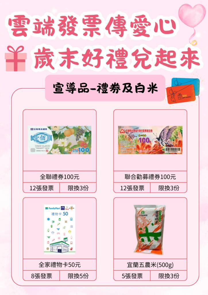 財稅局表示,本發票募捐活動將於今(114)年11月25日熱烈開跑,宣導品種類相當豐富,從禮券、微波保鮮盒、刀具組、絨毯、白米到清潔用品等,可謂琳琅滿目!活動時間到同年12月26日結束,請有意願參與的縣民把握時間,於辦公時間至財稅局總分局一樓雲端發票一站式服務專櫃辦理發票捐贈,該局也特別推出「縣府+鄉鎮市公所+學校不定點巡迴快閃」全新模式,走進社區、學校、地方機關,讓雲端發票推廣更親民、更接地氣!各項宣導品數量有限,送完為止,手腳要快喔~
