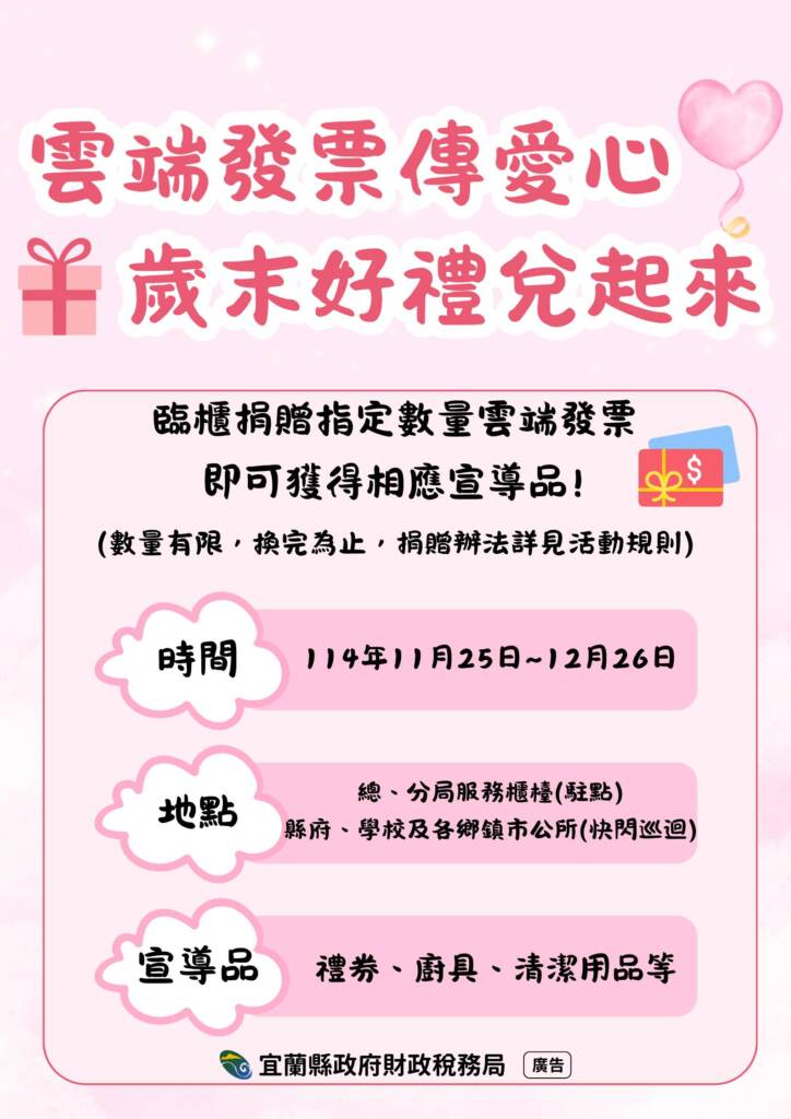 歲末到來,是時候用發票做公益,並把好運帶回家!宜蘭財稅局為鼓勵縣民消費時以載具儲存雲端發票,並看見捐贈雲端發票的便利與意義,特於年末推出超受期待的「雲端發票愛心傳遞.歲末好禮兌起來!」活動,只要臨櫃捐贈指定張數的雲端發票,並回答租稅問題,便可獲得相應的宣導品,募得之雲端發票將透由財政部電子發票整合服務平台全數轉贈予縣內社會福利團體!讓大家「捐發票、做公益、拿好禮」一次到位!