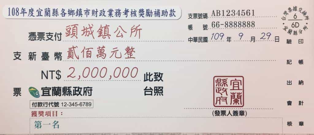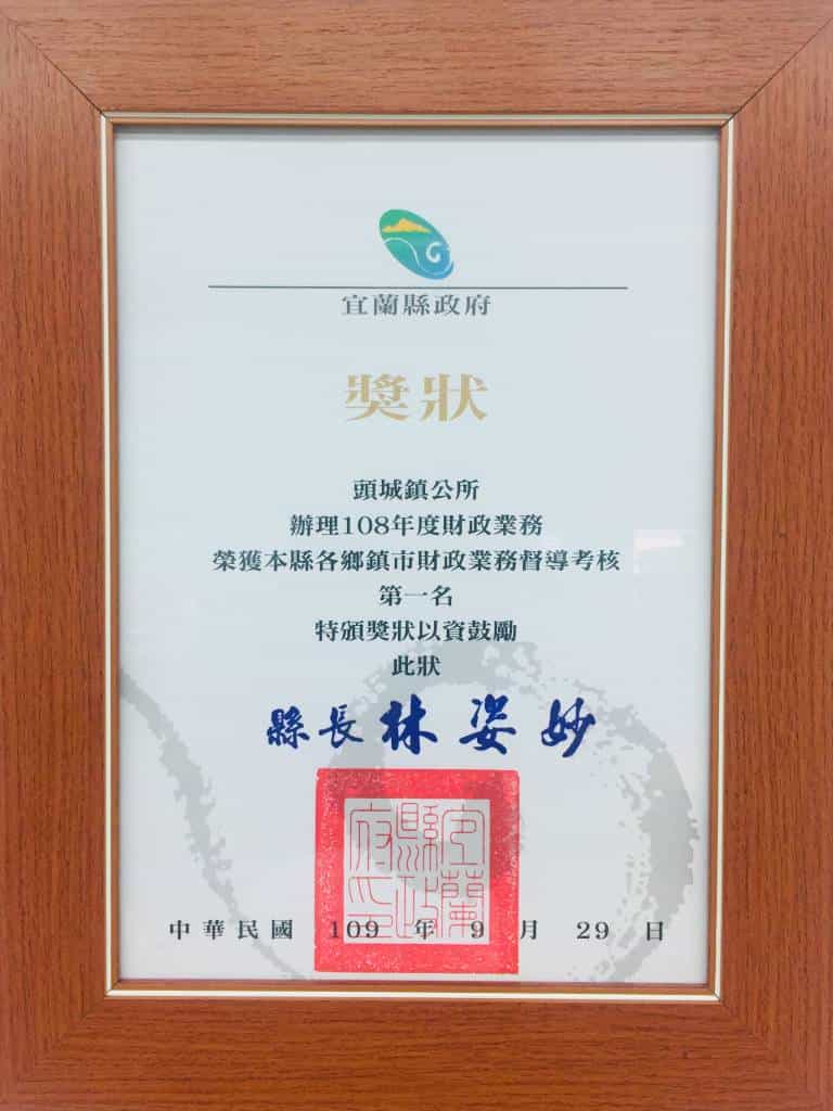 頭城鎮公所自107年、108年,連續兩年獲得全縣『財政考核第一名』的佳績後,今(109)年再創新高,成功勇奪『三連霸』的榮耀,並於今(10/29)日上午09:30在縣府舉辦的擴大縣務會議中接受表揚。