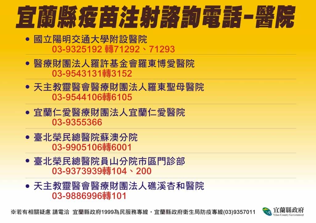 近來接獲民眾詢問7月9日前已施打第一劑莫德納疫苗之孕婦及1-3類人員,第二劑施打相關事宜,林姿妙縣長已責成相關單位研議,將縣內剩餘莫德疫苗優先保留給已施打第一劑之孕婦及醫事人員,並持續積極向中央爭取足夠疫苗量供1-3類人員施打第二劑。請7月9日前已施打第一劑莫德納疫苗之孕婦及1-3類人員,向原施打單位預約登記,工作人員會分流安排施打,各醫院預約諮詢專線(如附圖)。
