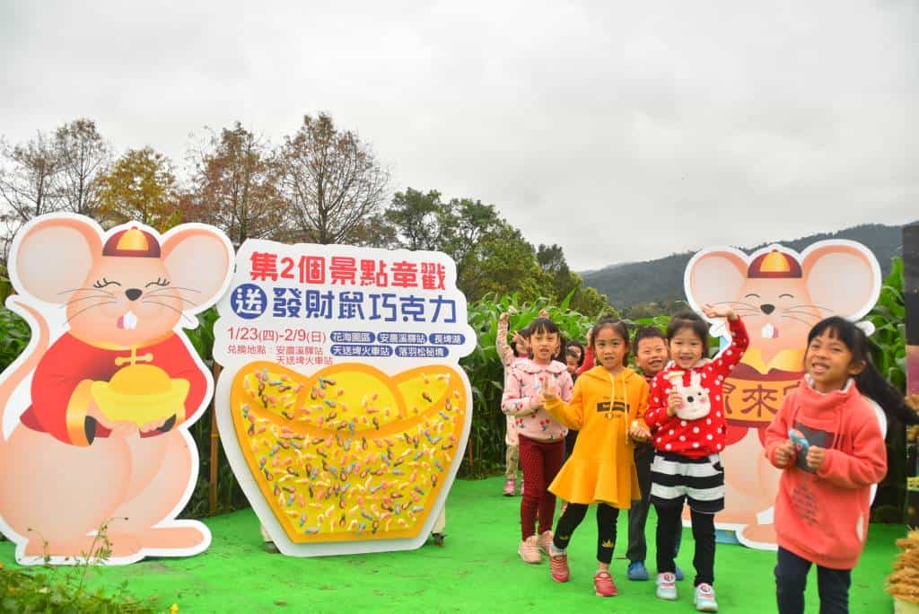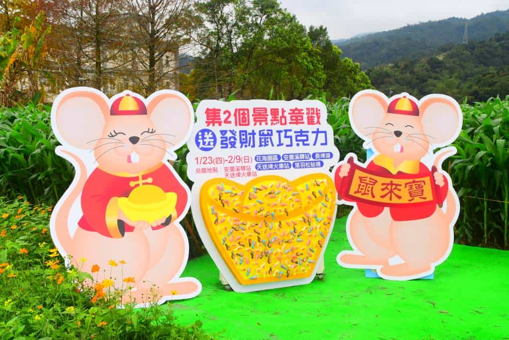 今年春節期間,遊客到三星鄉的景點,三星鄉公所還要送發財鼠巧克力給遊客,只要在三星花海園區、落羽松秘境、長埤湖、天送埤火車站、安農溪驛站等景點蓋章戳,集滿任2個景點章戳,就可以在安農溪驛站及天送埤火車站兌換發財鼠巧克力,每人限領一支,活動自1月23日至2月9日,數量3000支送完為止。另外,大年初一至初三到花海園區,走玉米探險迷宮再加碼送一支,每日限量300支,上午9時開始發送。