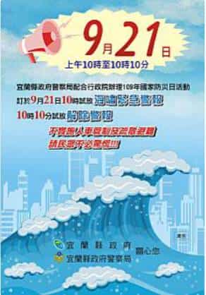 宜蘭縣政府警察局為配合行政院辦理109年國家防災日活動,訂於9月21日(星期一)上午10時整試放海嘯緊急警報,10時10分試放海嘯解除警報,不實施人車管制及疏散避難,請民眾不必驚慌