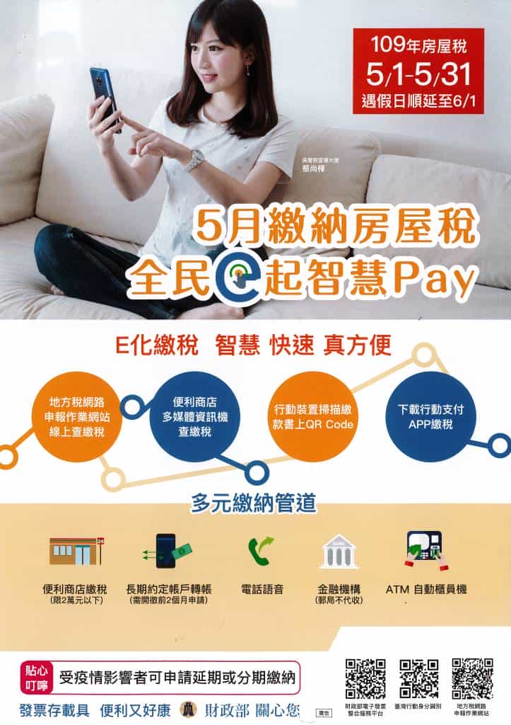 財政稅務局表示:為響應無紙化環保政策,該局指出,民眾可利用已註冊之健保卡/自然人憑證/工商憑證/T-Fido行動憑證登錄地方稅網路申報網站線上查詢繳納稅款,或稅額在2萬元以下亦可持上開憑證就近至四大便利超商,使用多媒體資訊機 (如:7-11的ibon、全家的FamiPort、OK的OK‧go、萊爾富的Life-ET)自行列印當期房屋稅繳款單,直接在超商櫃臺繳稅,快速又方便。
