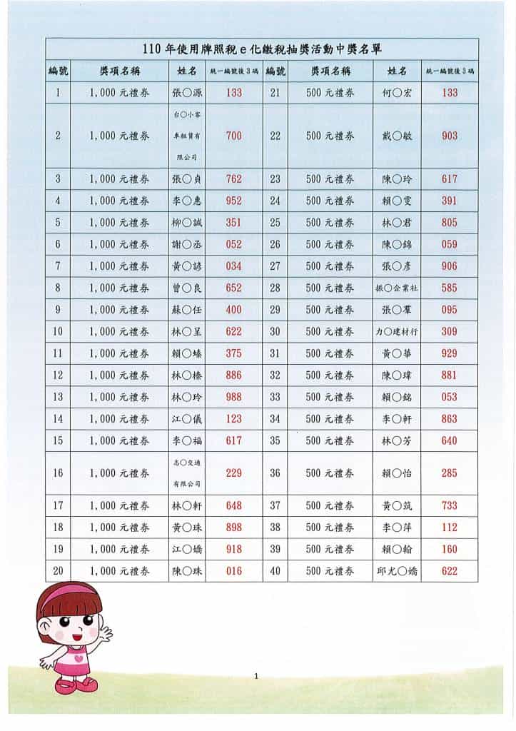 此活動抽出1,000元禮券20名、500元禮券40名及300元禮券20名,財政稅務局近期內會以掛號通知中獎人,請中獎人在本(110)年7月30日前攜帶身分證明文件及雲端發票1張或紙本發票2張至該局領取,逾期視同放棄。中獎名單亦可上該局網站(www.iltb.gov.tw)或FB粉絲專頁查詢。另外財政稅務局也提醒鄉親110年房屋稅已於5月份開徵,使用e化方式繳納本縣房屋稅也可參加抽獎,歡迎民眾多加利用。