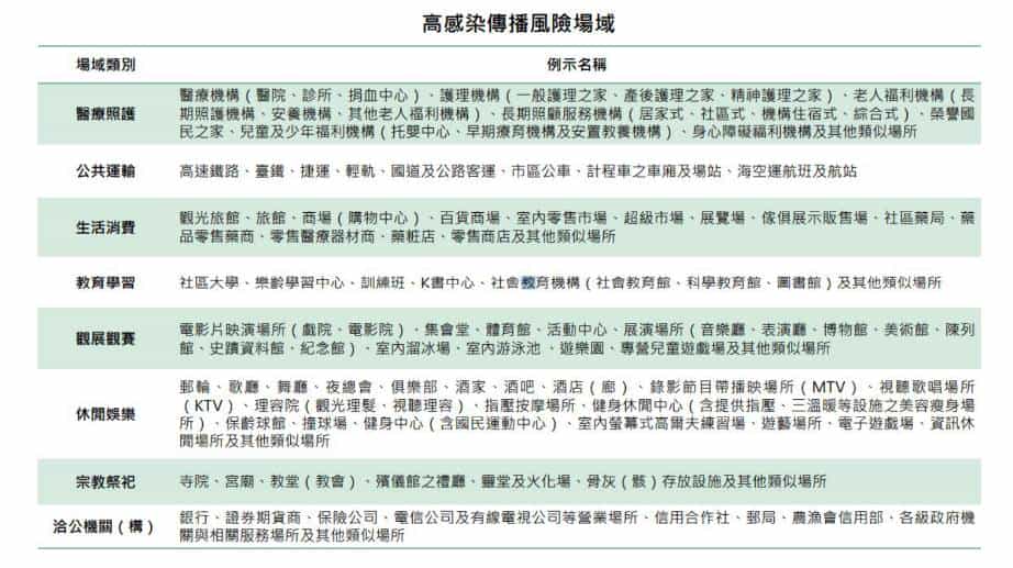 中央流行疫情指揮中心公告 8 大類場所(如附圖)包括醫療照護、大 眾運輸、生活消費、教育學習、觀展觀賽、休閒娛樂、宗教祭祀、洽公 等因屬具有不易保持社交距離,或會近距離接觸不特定對象(不認識的人) 的特性,有較高的感染與傳播風險,也請民眾多多配合,共同維護大家 的健康。