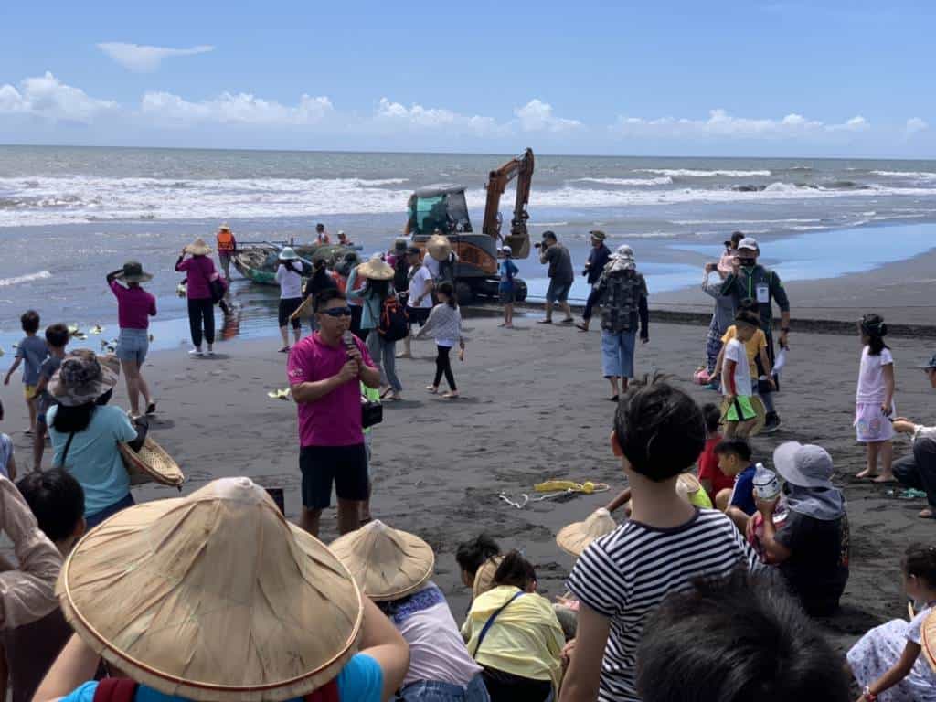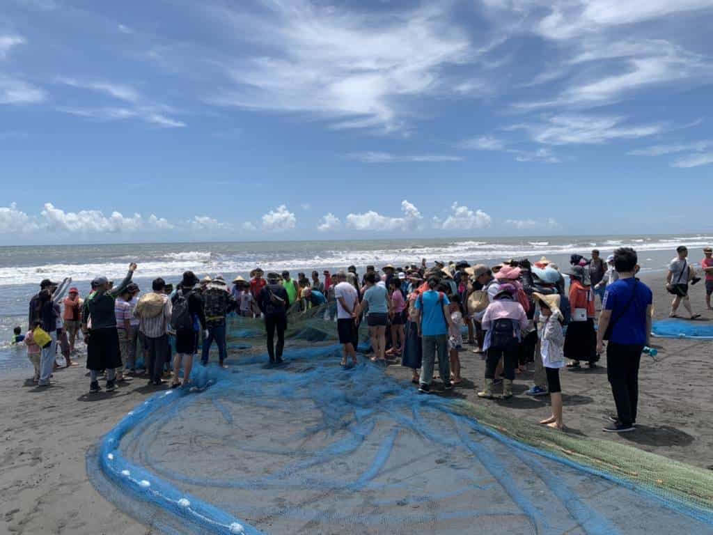 今天「牽罟」活動所在的後埤社區,邀請壯圍鄉鄉長沈清山、宜蘭縣縣議員黃建勇和宜蘭大學生物技術與動物科學系陳永松老師參加,並有來自各地的學員約有150位參與今日的活動。今日活動雖有一些風浪,但還是在大家合力下,順利出船撒網,靠全體學員和工作人員的力量拉回漁網,讓大家回到社區享受一道道美味的牽罟風味餐。