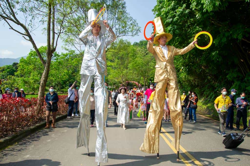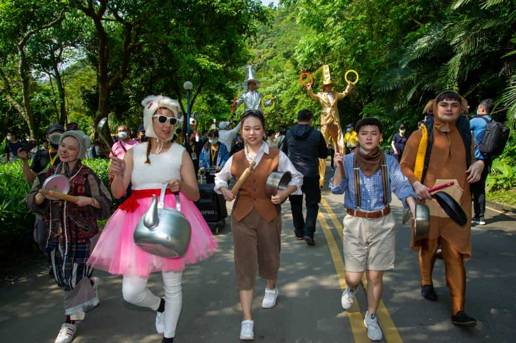 今(27)日遊藝隊伍由知名蘋果劇團帶來的大型偶具與清溝社區陸上龍舟、清溝國小鼓團、新象創作劇團、喜姆比舞蹈藝想空間、宜蘭縣私立博愛幼兒、蘇西社區等表演團隊等一起進行園區遊藝行動,上午九點廿分起,武荖坑園區五個定點啟動現場表演,第一隊遊藝隊伍從雲天草原出發,依序加入各表演團隊,吸引入園民眾駐足觀賞或加入踩道遊行,遊藝隊伍在熱鬧舞樂聲中回到夢想騎士表演舞台入口兩側,列隊歡迎民眾入場,揭開活動序幕。