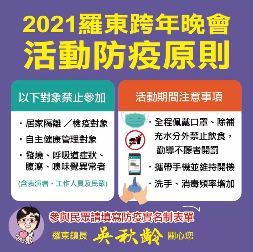 羅東鎮公所將於109年12月31日晚上七時至翌日零時三十分,在羅東中山公園辦理2021羅東跨年晚會,為了讓節目更精彩可期,鎮公所今年特別規劃五大元素;除流行星光藝人、重磅搖滾樂團及熱血蘭陽青年外,更加入火紅嘻哈饒舌與潮流電音DJ。