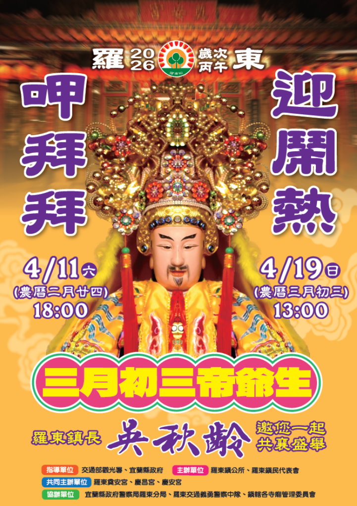 羅東鎮公所為迎接三月初三帝爺生,結合在地傳統宗教節慶,舉辦迎熱鬧呷拜拜活動,以文化尋根,讓羅東人重回往日光榮感。「呷拜拜」訂於4月11日(農曆二月廿四,星期六)在羅東鎮公所周圍舉辦,「迎鬧熱」訂於4月19日(星期日)遶行羅東鎮內街道,祈求全鎮平安。