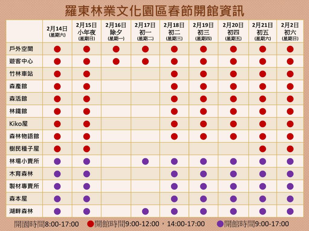 溫馨提醒,除夕(2月16日)及初一(2月17日)園區戶外空間及遊客中心開放時間為8時至17時;初二至初六各林業展示館舍開放時間為上午9時至12時;下午14時至17時,並每日提供多場定時定點導覽解說服務。各據點解說時間為:遊客中心10:30、15:30;竹林車站9:30、14:30;森產館10:00、15:00;森活館10:30、15:30;林鐵館11:00、16:00,歡迎民眾踴躍參加。