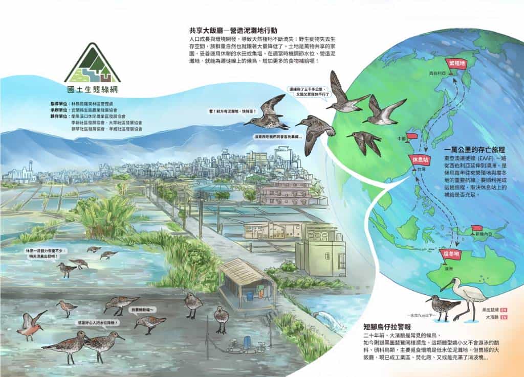 台灣位處全球八大候鳥遷徙路線之一的「東亞澳遷徙線(EAAF)」上,近年沿線各國臨海濕地大量開發,導致不會游泳、高度依賴「低水位泥灘地」環境的鷸、鴴科鳥類受到嚴重威脅,以大濱鷸為例,二十年前還是普遍常見的鳥種,但如今族群量已減少77%。春天是候鳥從南方度冬地回到北方繁殖地的季節,這段超過半個地球的遷徙旅程,就像跑馬拉松一樣,需要經過多處停留補給,才能抵達目的地,而宜蘭正是其中一處重要的補給站,但春季水田皆已插秧,挑惕的鷸、鴴科只喜歡開闊且視野良好的泥灘地,因此魚塭就成了重要且唯一的選擇。