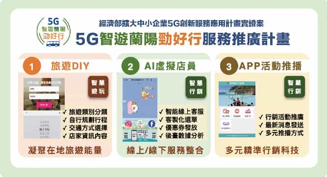 另5G智遊蘭陽勁好行服務推廣計畫是以智慧觀光創新應用服務為核心,串聯宜蘭市在地店家,提供跨領域輔導機制,引導店家共同發展在地5G多元應用服務,藉由平台的導遊、導客及導購整合創新一站式服務,為民眾帶來5G時代下視覺與聽覺的特色饗宴,並加速發展5G創新服務應用商機。期待未來,透過5G創新應用服務行銷推動下,吸引更多遊客來宜蘭市體驗與觀光消費,創造有文化、有歷史、有故事、有特色的宜蘭舊城之旅。