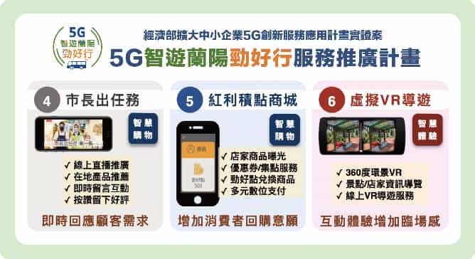 宜蘭市長江聰淵指出,藉由經濟部中小企業處「擴大中小企業5G創新服務應用計畫實證案」-5G智遊蘭陽勁好行服務推廣計畫,號召宜蘭市在地精選160家優秀店家,跨足美食、旅遊、文創、服務及民生等多面向業種,共同來推廣宜蘭在地風光、特色美食、特色產品,以「實現5G智慧觀光應用」為目標,以「網紅x社群x直播x電商平台」的新媒體商業模式期能深化在地店家創新能量,驅動區域特色應用發展。