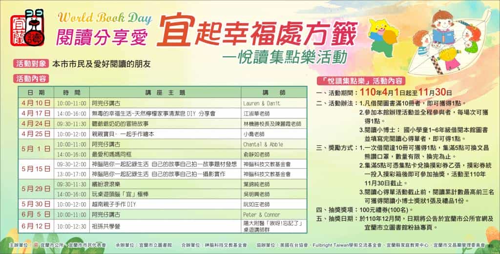幸福活動報名於110年4月1日上午8:00起,詳細活動內容及報名請至 https://reurl.cc/NX2bnn ,採線上報名,額滿為止。「悅讀集點樂」活動期間為今(110)年4月1日至11月30日止,凡參加本館活動並全程參與者,每場次可獲得1點;在宜蘭市立圖書館借閱圖書每滿10冊或是國小學童1~6年級借閱本館圖書並填寫完閱讀心得單者,也可獲得1點。集點卡集滿5點可憑集點卡兌換文昌熊讚醫療級口罩乙份或摸彩券乙張。摸彩券統一投入摸彩箱後即可參加抽獎,並將於110年12月公開抽獎(兌換贈品數量有限、換完為止),相關活動詳情請電洽宜蘭市立圖書館03-9325604#852或至宜蘭市立圖書館粉絲專頁搜尋https://www.facebook.com/ilancitylibrary/。